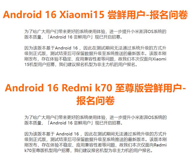 首先是新系統(tǒng)版本嘗鮮計(jì)劃,小米已正式啟動(dòng)面向Xiaomi 15與Redmi K70至尊版用戶的“Android 16嘗鮮用戶”招募計(jì)劃,為每款機(jī)型限量開(kāi)放1000個(gè)名額。