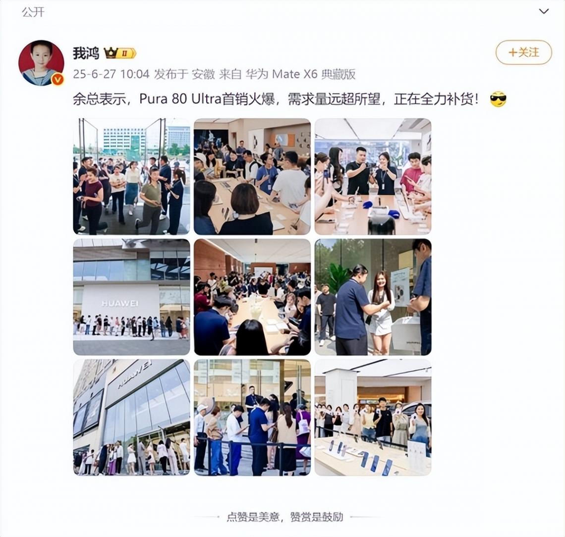 6月27號華為最新款頂級手機Pura 80 Ultra正式開賣,線下門店被擠得水泄不通。上午十點多剛開賣沒幾分鐘,各個型號庫存就全沒了。據說是線下店人特別多,手機柜臺圍得里三層外三層,現場工作人員都在喊讓大家別往前擠。