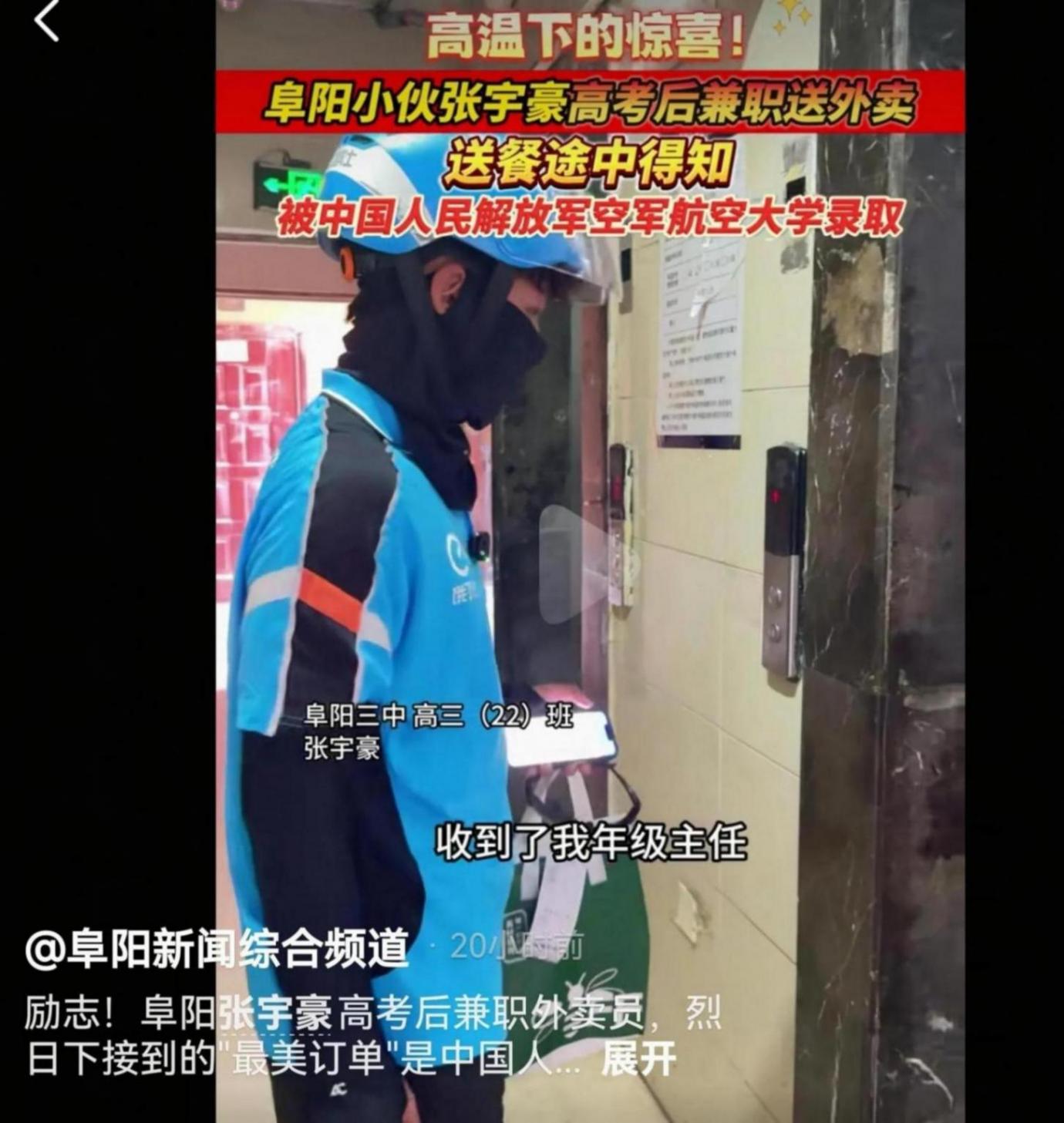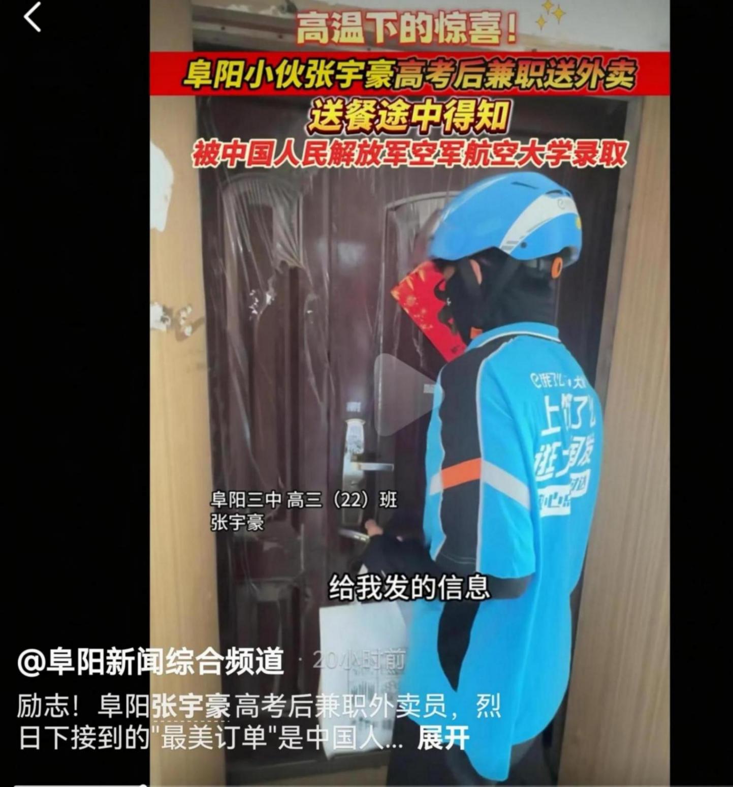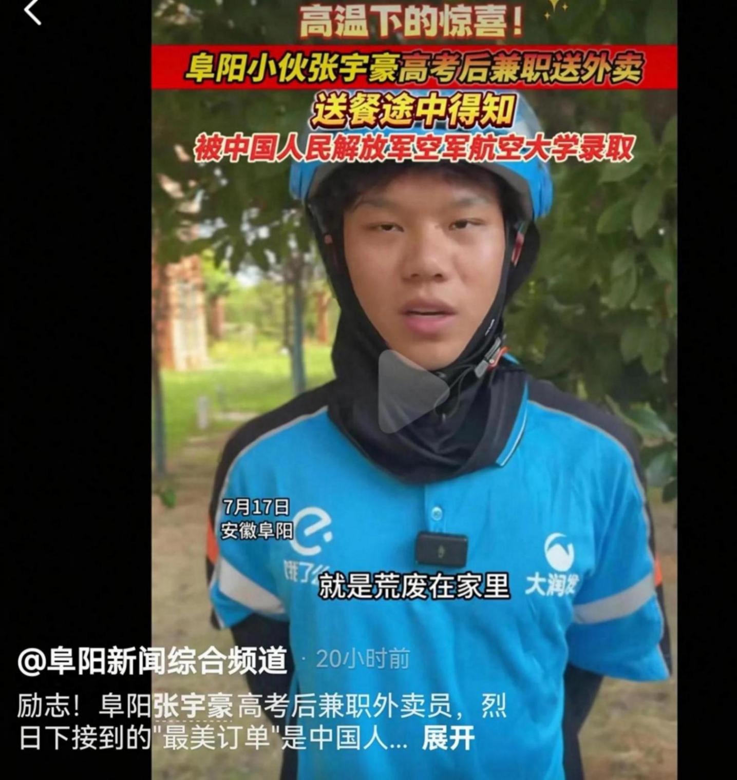 烈日下的“最美訂單”!外賣小哥張宇豪送餐途中接到空軍航空大學錄取通知