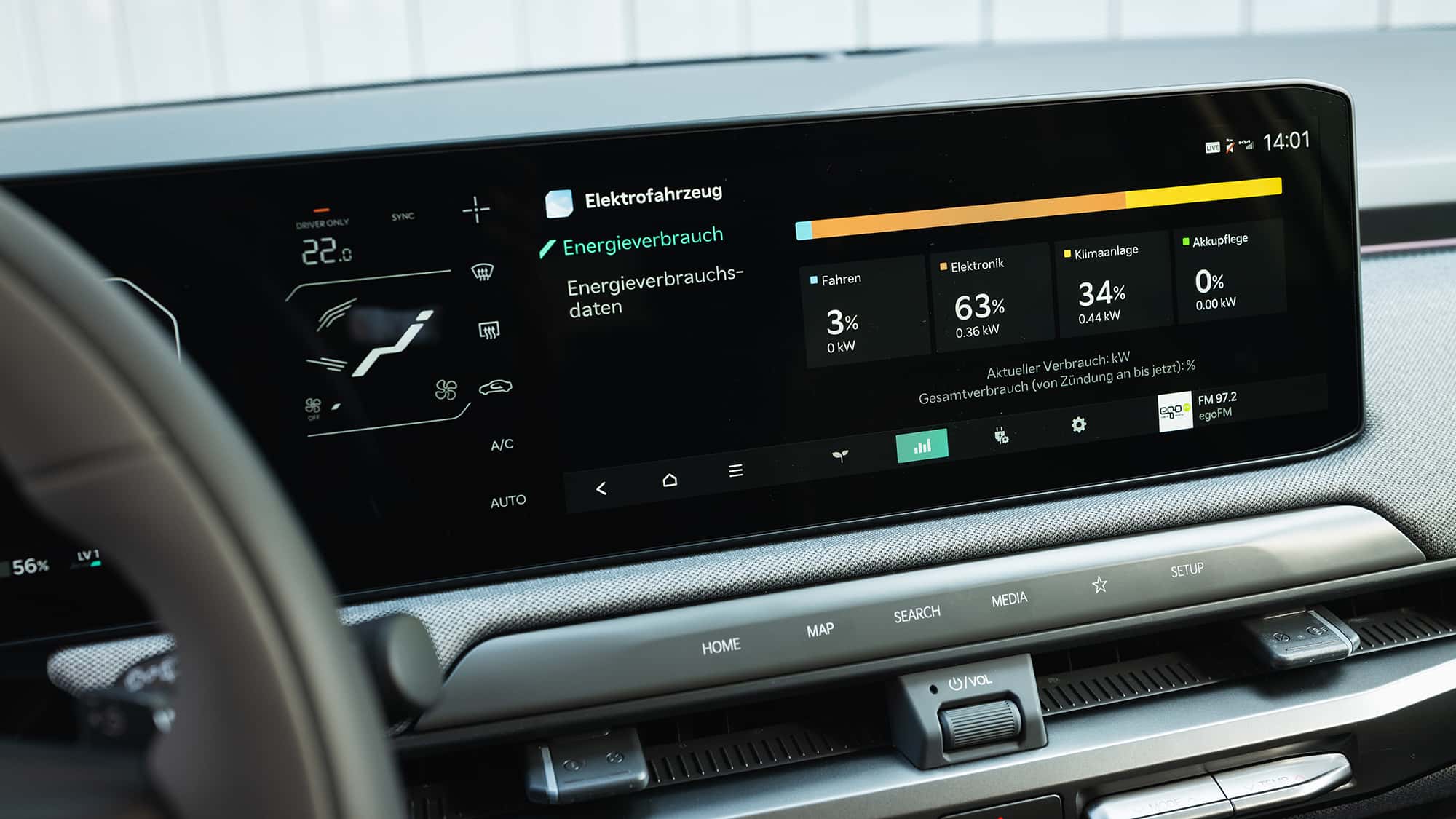 駕駛艙設計也頗具匠心,儀表臺部分采用環??椢?,配備大尺寸顯示屏,中央扶手帶有可拉出的餐桌/工作平臺,并配有230伏插座,適合在后排充電或辦公。后排空調出風口也做得很好,而這在Born與菲亞特中都未配備,后排乘客只能依賴前排座椅下的出風口。