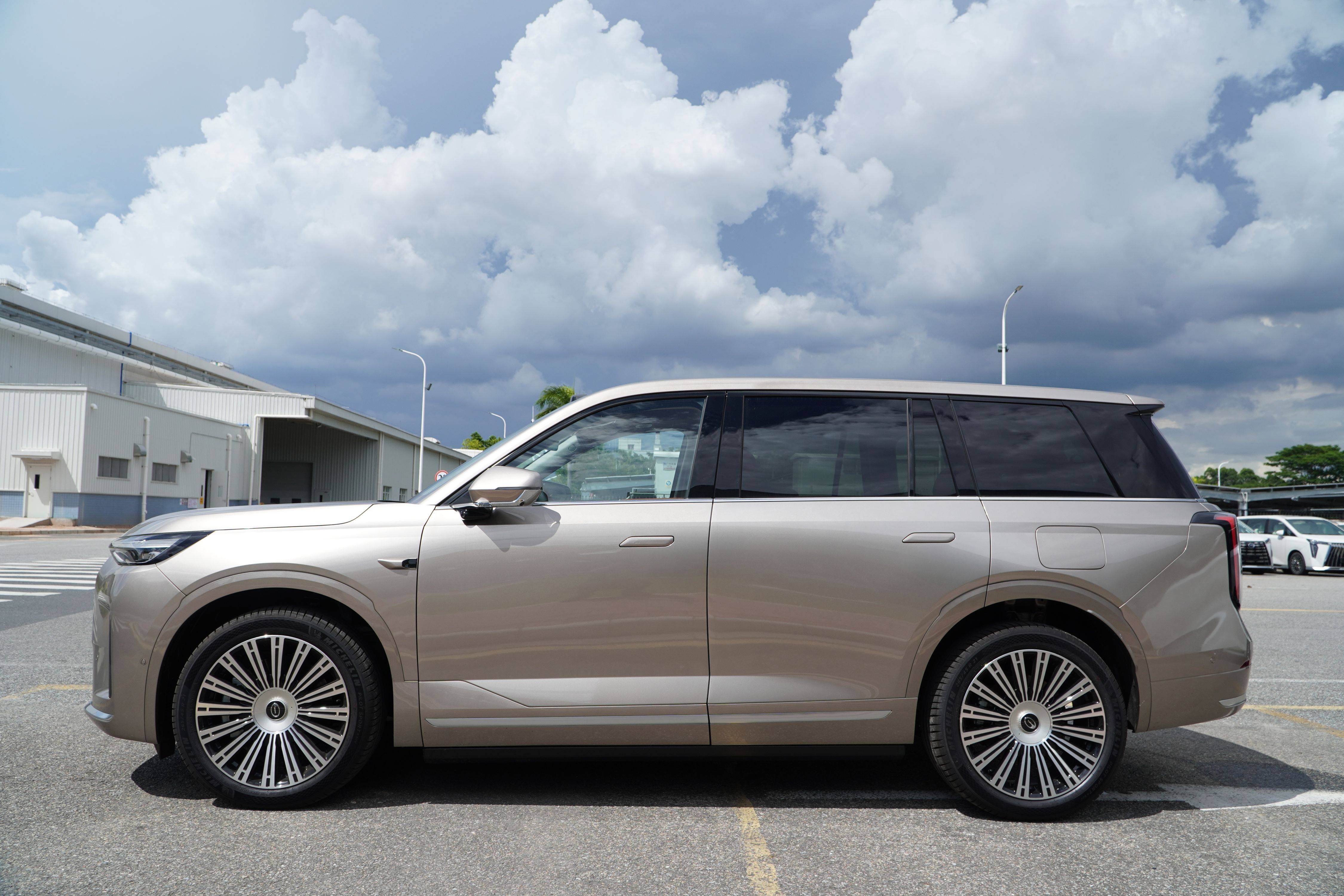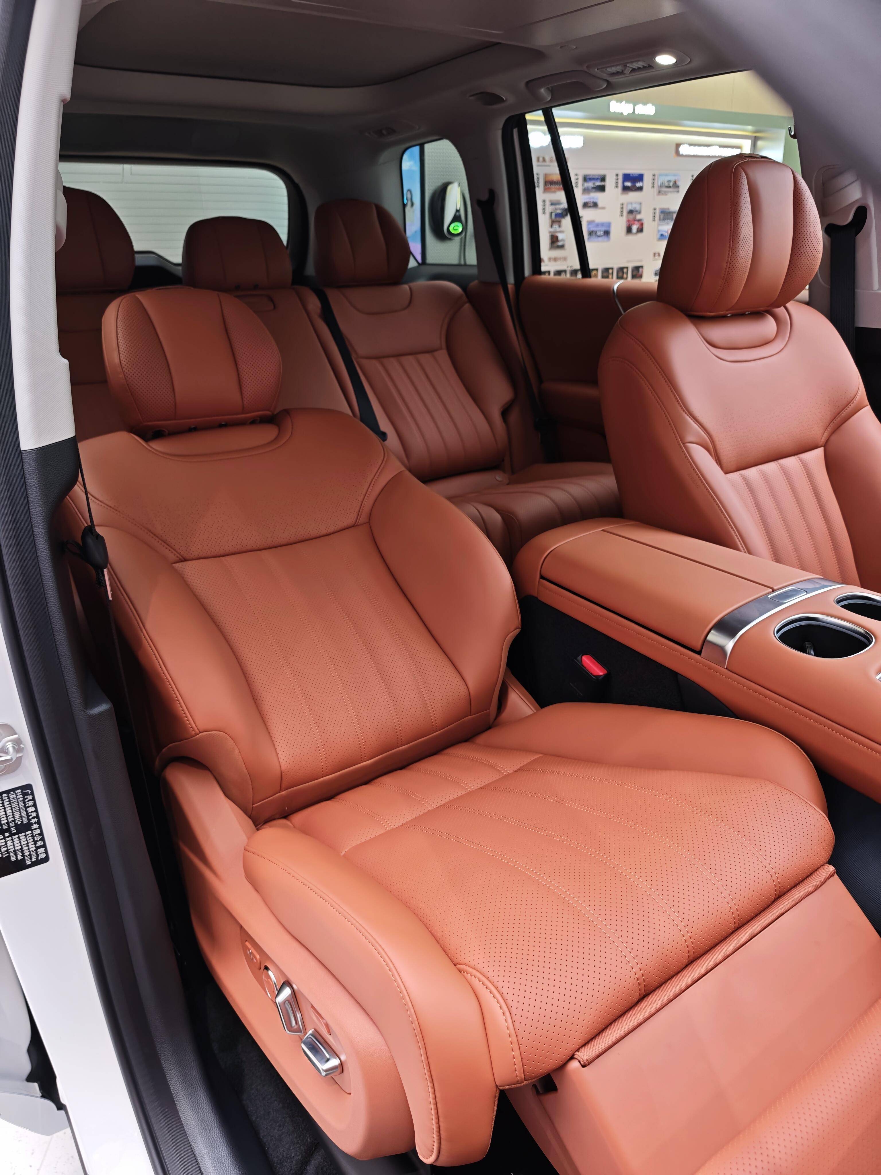 車身尺寸長寬高分別為5060/1950/1760mm,軸距2930mm,相比同級理想L6/ L7、問界M7更大一些。龐大的身軀配合方正飽滿的輪廓,給人感覺很有氣場,而懸浮式車頂、21英寸密輻式輪轂的加持,又帶來了豪華氣息,并提供更具尊貴感的雙拼色車身+“大餅”輪轂。而隱藏式門把手、貫穿式尾燈等時尚元素也均沒有缺席,同時尾燈內還將搭載9英寸LED燈語屏,支持8種交互燈語。